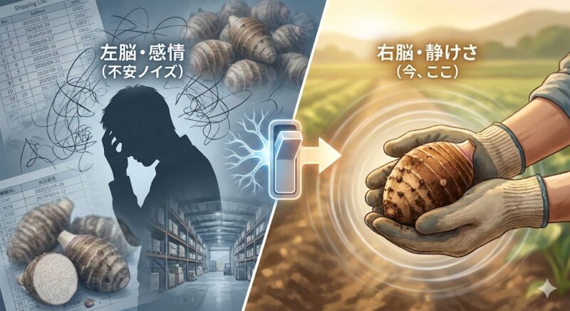つまり、私が海老芋の割り当てや精米の納期で感じていたあの「不安」や「焦り」といった感情を作り出している犯人は、「左脳(特に感情モード)」だったというわけです。